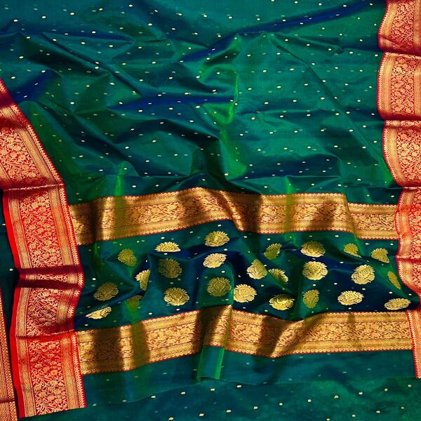 8800 Piece Description : A Chanderi Handloom Katan Silk Saree Is A Luxurious, Lightweight Saree From Chanderi, Madhya Pradesh, Known For Its Blend Of Fine Silk (katan) Threads Woven On A Handloom, Creating A Subtle Sheen, Soft Texture, And Durability, Often Featuring Traditional Motifs Like Coins, Flowers, Or Peacocks With Intricate Zari Work, Perfect For Festive Elegance. It Combines The Lightness Of Chanderi Fabric With The Richness Of Pure, Twisted Silk (katan), Showcasing Traditional Craftsmanship With Unique Patterns And A Distinct Luster, Making It A Prized Heirloom Piece. Location : Madhya Pradesh, India