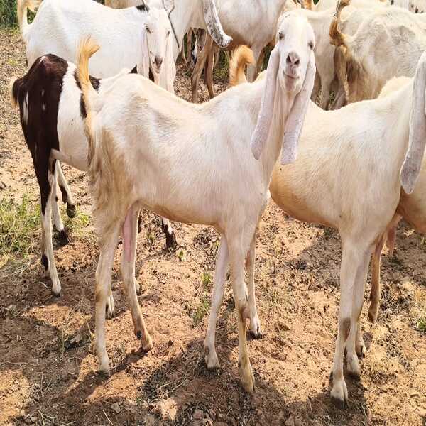 Sojat female goats (does) are distinct Indian goats from Rajasthan, known for their white coats (often with patches), long, flat drooping ears, and short tails, used primarily for meat but also milk. They have a well-developed udder with large, conical teats, are hardy in harsh climates, and feature fine body hair called feathers. Adult females weigh around 40-50 kg and are valued for meat quality, though milk yield is moderate. Location : Rajasthan, India