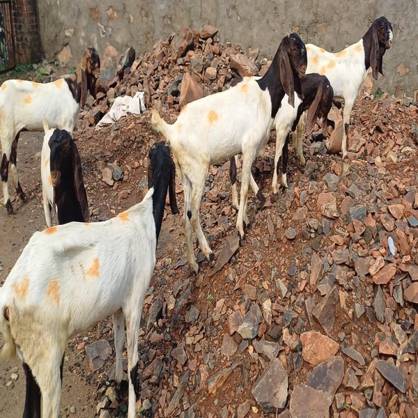 The Totapuri goat, also called Totapari, is a large Indian breed known for its distinctive parrot-like (Roman) nose and long, drooping ears, often with white or pale-red coats and brown patches. Valued for meat and milk, these robust, adaptable goats thrive in harsh climates, have high growth rates, and are known for their friendly nature, making them suitable as pets and livestock. Males often have beards, and both sexes have medium-sized, backward-curving horns. Location : Rajasthan, India