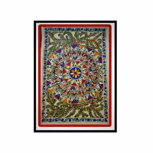 A Madhubani Tree of Life painting is a vibrant depiction of ecological and spiritual harmony, characterized by a central, flourishing tree that connects the earth to the heavens. Intricately detailed using the Kachni (fine line-work) or Bharni (solid color) styles, the artwork leaves no space empty, filling the canvas with symbolic motifs like birds for love, fish for fertility, and lotus flowers for purity. Traditionally created with natural dyes and nib-pens, this Kalpavriksha serves as a sacred representation of the interconnectedness of all living beings and the eternal cycle of life. Location : Delhi, India