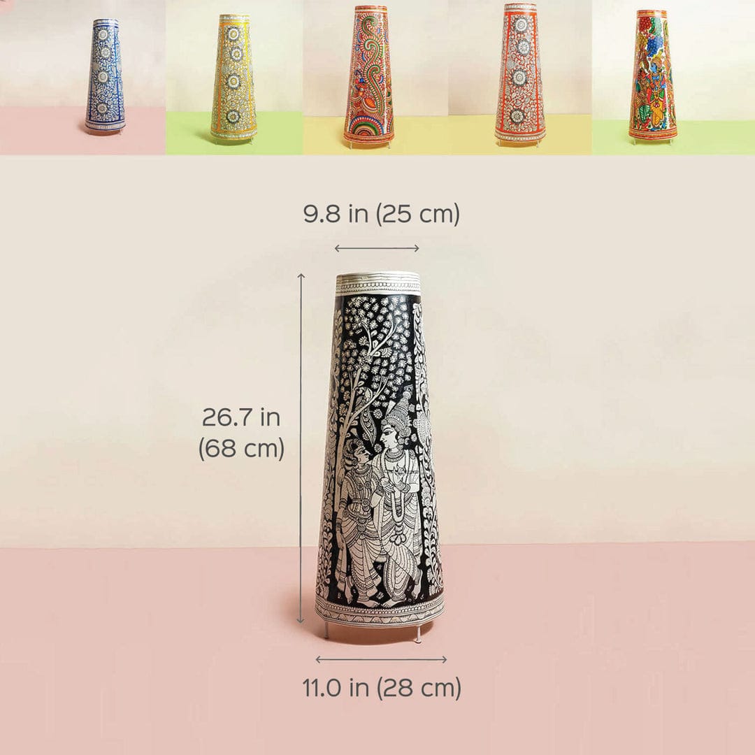 2750 Piece Description : Tholu Bommalata Otherwise Known As Leather Puppet Dance / Leather Puppetry Is An Ancient Traditional Artform From Andra Pradesh. This Artform Is Diligently Crafted By Highly Skilled Artisans Who Have Mastered The Art Over A Long Period. These Lamps Are Made On Leather That Is Stretched Over Metal Frames. The Painting Is Hand Drawn With Natural Inks And Dyes. The Leather Is Also Perforated Along The Painting Which When Lit Creates A Beautiful Effect On The Wall. Location : Andhra Pradesh, India