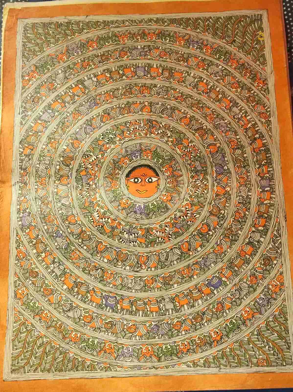 4565 Piece Description : Madhubani Paintings Use Geometric Shapes Like Triangles, Circles, And Squares To Create Symmetrical Patterns And A Sense Of Visual Harmony. The Shapes Are Used To Represent The Five Elements Of Life: Earth, Water, Fire, Sky, And Air. Location : Jharkhand, India