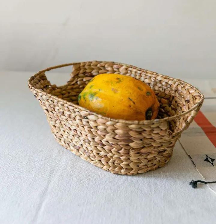 1209 Piece Description : Water Grass Oval Basket. Channel Heritage And Handwoven Natural Decor Accent With These Grass Baskets. Use It As A Accent Piece Or As A Fruit Basket . Equally Useful At The Entrance To Collect Keys And Get All. Great For Outdoor Balconies Or Patio Furniture. Ideal For Farmhouse Or Garden Settings, Rustic And Bohemian Style Brings Out The Best In Picnic And Outdoor Events. Ideal As A Declutter For Table Or As An Accent Piece. Dazzle Your Decor With These Natural And Earthy Baskets. Location : Uttar Pradesh, India