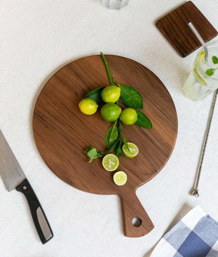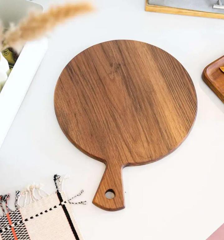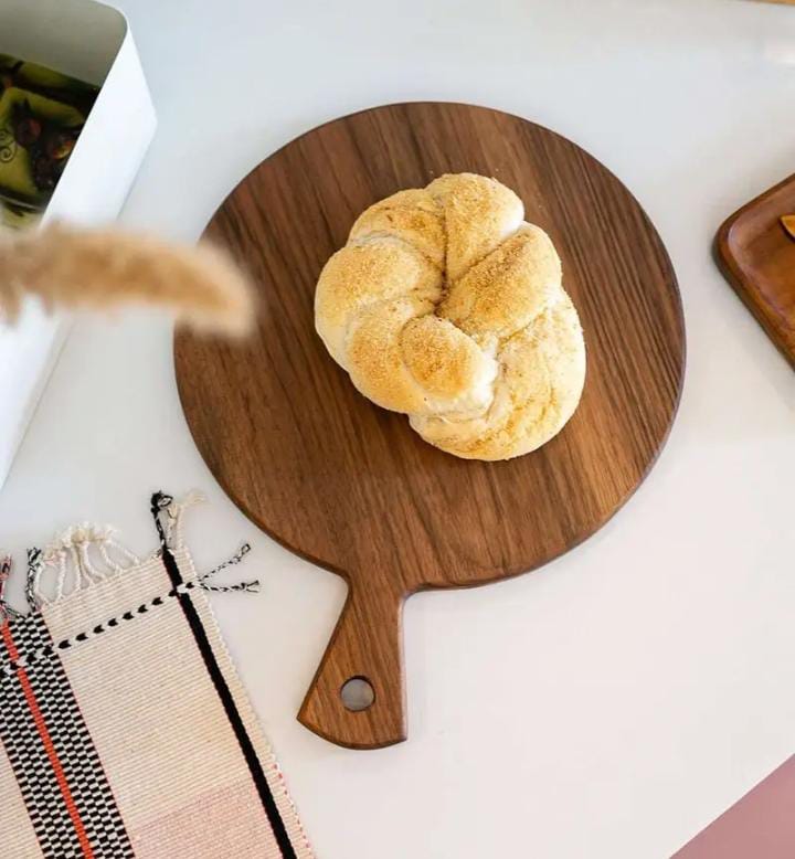 1814 No. Description : Immerse Yourself In The Natural Beauty Of Walnut Wood With Our Round Cutting And Serving Board. Carefully Selected For Its Rich Hues And Durable Characteristics, This Board Promises To Be A Timeless Addition To Your Kitchen. Location : Uttar Pradesh, India