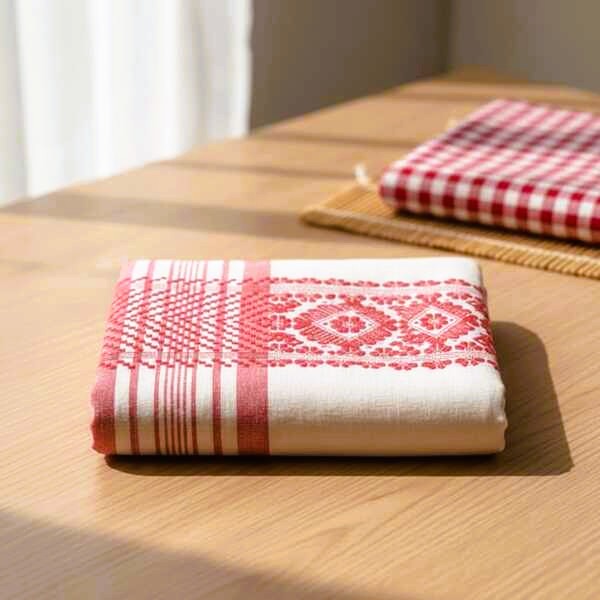 The gamosa or gamocha is a hand-woven rectangular cotton piece of cloth with red borders and different designs and motifs. It is traditionally offered to elders and guests as a mark of respect and honour by Assamese people. Location : Assam, India