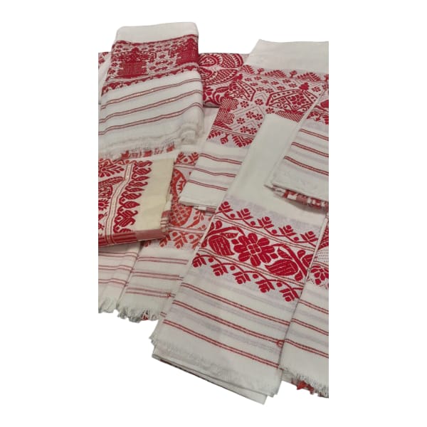473 Piece Description : The Gamosa, A Traditional Assamese Handwoven Cloth, Is A Rectangular Piece Of White Cotton Fabric With Red Or Maroon Borders And Often Features Woven Motifs, Serving As A Symbol Of Respect, Hospitality, And Cultural Identity Location : Assam, India