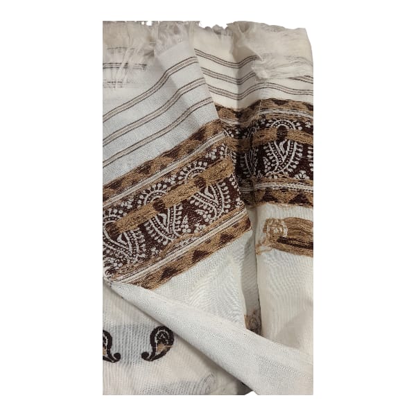 A Mekhela Chador is a traditional garment worn by women in Assam, India. It consists of two main pieces: the mekhela, which is a skirt-like garment that drapes around the waist, and the chador, a long piece of cloth that is draped over the shoulder and around the body. The outfit is usually made of silk or cotton and is known for its intricate designs, often featuring Assamese motifs and patterns. It is worn during festivals, cultural events, and special occasions, representing the rich cultural heritage of Assam. Location : Assam, India