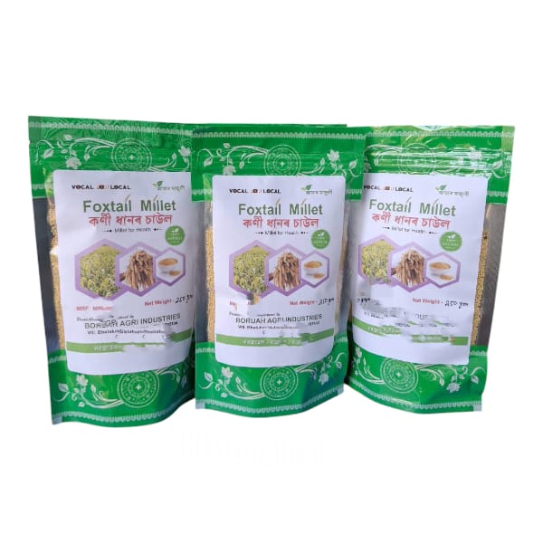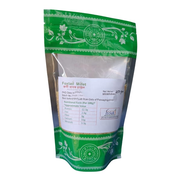 The Golden Grain of Antiquity: Foxtail Millet – Your Modern Superfood Historical & Botanical Foundation Foxtail millet (Setaria italica) is one of the worlds oldest and most resilient cultivated cereal crops, boasting a history that stretches back over 8,000 years to ancient Asia and Africa. Botanically, it is a member of the grass family, named for its distinctive, bristly seed head that resembles a foxs tail. As a crop, it is celebrated for its incredible hardiness; it thrives in semi-arid regions with minimal rainfall and poor soil quality where more demanding grains like rice or wheat would fail. Because it matures rapidly—often within 60 to 90 days—it serves as a vital tool for sustainable agriculture and food security in changing climates. Nutritional Profile & Health Benefits Nutritionally, foxtail millet is categorized as a nutri-cereal due to its dense concentration of essential vitamins and minerals. It is naturally gluten-free, making it an indispensable staple for those with celiac disease or gluten sensitivities. Unlike polished white rice, foxtail millet is rich in dietary fibre and has a low glycaemic index, which helps regulate blood sugar levels and promotes long-lasting satiety. It is also a significant source of protein, iron, magnesium, and calcium, alongside B-vitamins like thiamine, which support heart health, nerve function, and the prevention of anaemia. Culinary Versatility & Texture From a culinary perspective, the grain is prized for its versatility and mild, nutty flavour. In its de-husked form, it appears as tiny, pale-yellow pearls that cook into a light, fluffy texture similar to couscous. This neutral flavour profile allows it to seamlessly replace rice in traditional dishes like pilafs, porridges, and stir-fries, or to be ground into flour for gluten-free baking and flatbreads. Beyond its use in the kitchen, the grain contains high levels of antioxidants and polyphenols that aid in detoxification and overall digestive wellness. Climate-Resilient Agriculture Foxtail millet is a climate warrior that thrives in harsh, semi-arid regions where other grains fail. It requires significantly less water than traditional paddy rice, making it a sustainable alternative that preserves precious groundwater. By shifting away from water-intensive monocultures, this crop restores soil fertility and builds a drought-resistant ecosystem through minimal chemical use. Ethical Sourcing & Empowerment Our sourcing is built on transparent, direct-trade models that empower smallholder farmers and rural communities. By utilizing community-managed natural farming, we eliminate the need for costly synthetic fertilizers, reducing the financial burden on farming households. Working directly with Farmer Producer Organizations (FPOs) ensures fair wages and keeps profits within the community to fuel the Millet Revolution at the grassroots level. Embrace the power of an ancient grain that heals the earth and nourishes the soul—every purchase fuels a sustainable cycle of health, climate resilience, and grassroots empowerment. Location : Assam, India