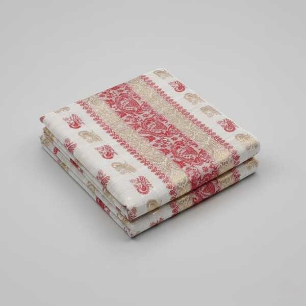 The Gamosa, a traditional handwoven rectangular cloth from Assam, is typically white with red borders and motifs and is used as a symbol of respect, hospitality, and cultural identity, often presented to guests or used in ceremonies. Location : Assam, India