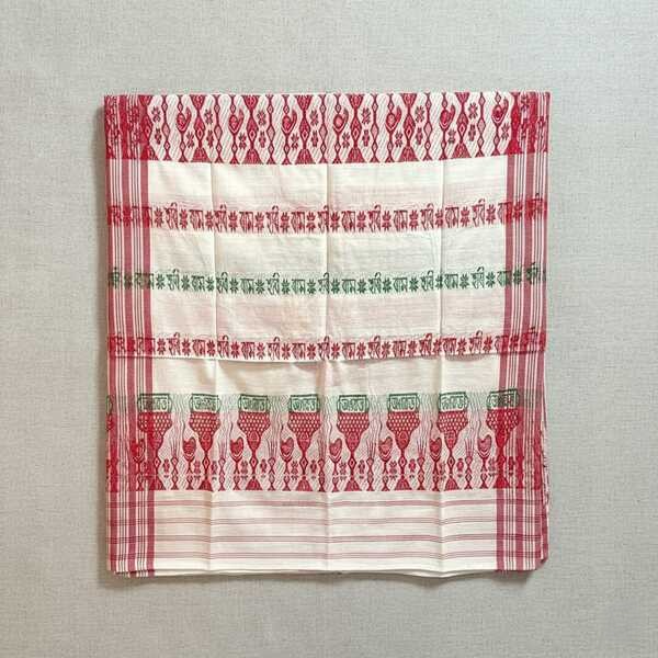 The Gamosa, a traditional handwoven cotton cloth from Assam, is a white rectangular piece with red or maroon borders and may feature decorative motifs, serving as a symbol of hospitality, friendship, and respect, and used in various cultural and religious ceremonies. Location : Assam, India