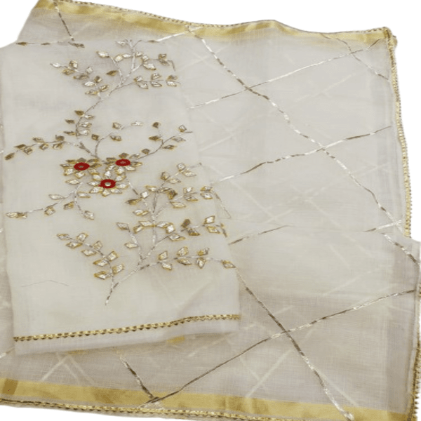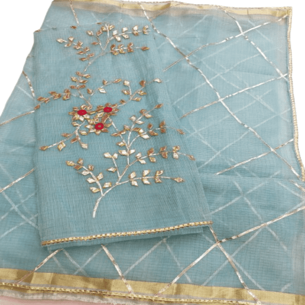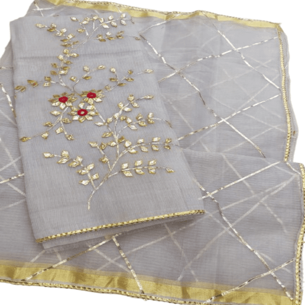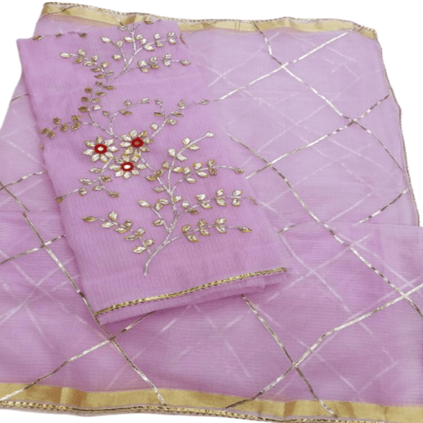 825 Set Description : A Kaccha Gota Suit Set Is A Traditional Indian Ethnic Outfit, Typically A 3-piece Ensemble, Featuring A Kurta, Pants, And A Dupatta, Adorned With Kaccha Gota Embroidery. This Style Is Known For Its Intricate, Handcrafted Designs Using Silver And Gold Metallic Ribbons Sewn Onto The Fabric, Creating A Beautiful And Elegant Look. Location : Rajasthan, India