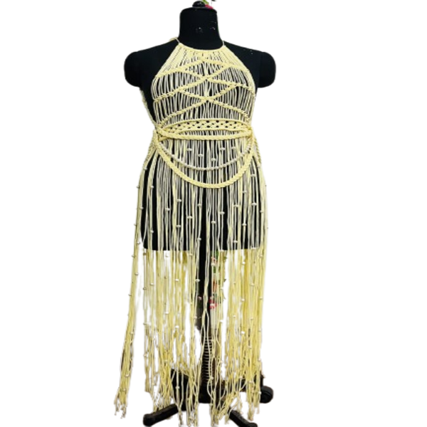 3299 Piece Description : A Macrame Cord Dress Is A Garment Crafted Using Macrame, A Fiber Art Technique That Involves Knotting Threads Or Cords To Create Patterns And Textures. These Dresses Are Often Designed To Be Versatile And Can Be Worn For Various Occasions, Including Beachwear, Festivals, And Special Events. Location : Jammu & Kashmir, India