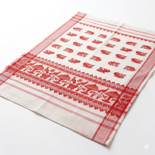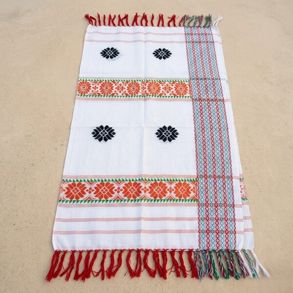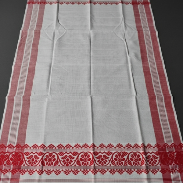 A one-sided Fulam Gamosa, a traditional Assamese towel or scarf, features intricate floral motifs on one side, usually in red, against a white background, according to Indyhaat. It is made from yarn cotton and is known for its light weight, durability, and cultural significance. Location : Assam, India