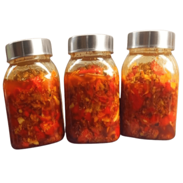King chilli pickle is a traditional pickle from the Northeast region of India, renowned for its extreme spiciness and distinct flavor. It is made with the king chilli, also known as Bhut Jolokia or Naga Jolokia, which is one of the hottest chilies in the world. The pickle typically includes a mix of spices, mustard oil, and sometimes ingredients like ginger, garlic, and kaji lemons for a unique flavor profile. Location : Assam, India