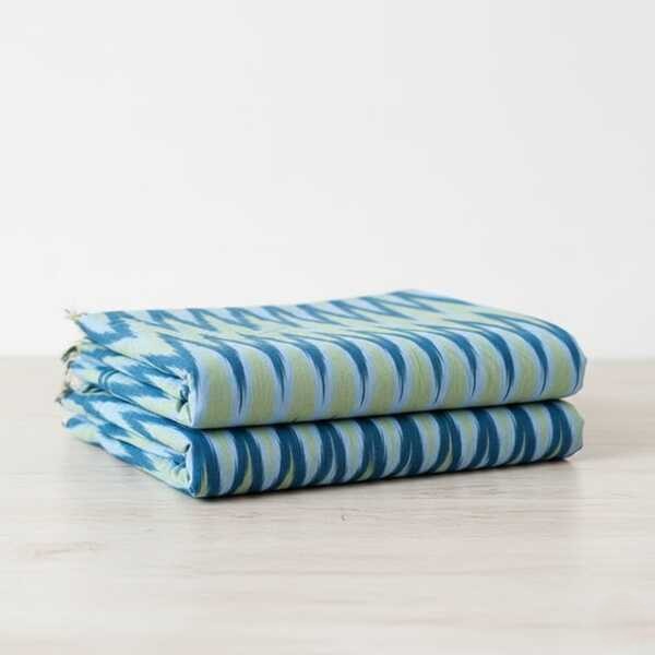 Ikat cotton fabric is characterized by its distinctive design created through a resist-dyeing technique applied to the yarn before weaving. This process involves tying sections of the yarn to create patterns, dyeing them, and then weaving the dyed yarn to produce the fabric. The result is a fabric with patterns that are visible on both sides and often have a subtle blurriness due to the shifting of the yarns during weaving. Location : Bihar, India