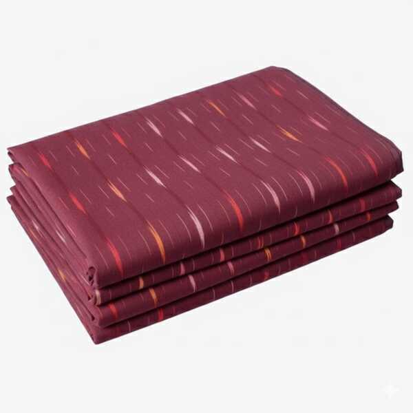 Ikat cotton fabric is characterized by its distinctive design created through a resist-dyeing technique applied to the yarn before weaving. This process involves tying sections of the yarn to create patterns, dyeing them, and then weaving the dyed yarn to produce the fabric. The result is a fabric with patterns that are visible on both sides and often have a subtle blurriness due to the shifting of the yarns during weaving. Location : Bihar, India