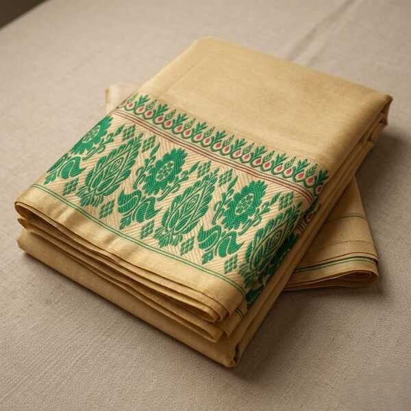 A Tussar Ghicha Screen Print Saree is a handwoven silk saree that incorporates a screen printing technique onto the Ghicha Tussar silk fabric. Ghicha silk, a byproduct of Tussar silk, is known for its natural texture and lustrous feel. The screen printing adds intricate designs, often in vibrant colors, to the saree, making it a unique blend of traditional craftsmanship and modern artistry. Location : Jharkhand, India