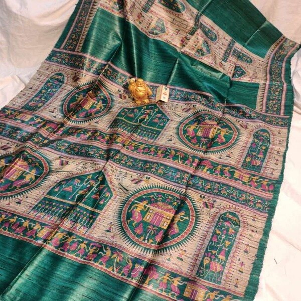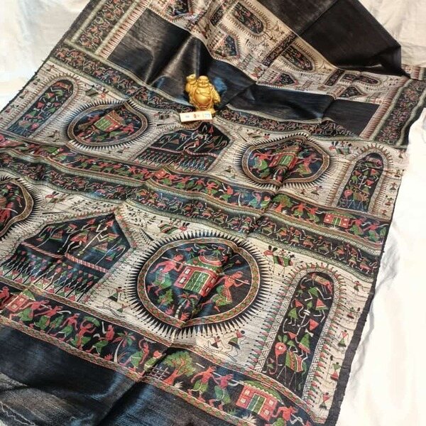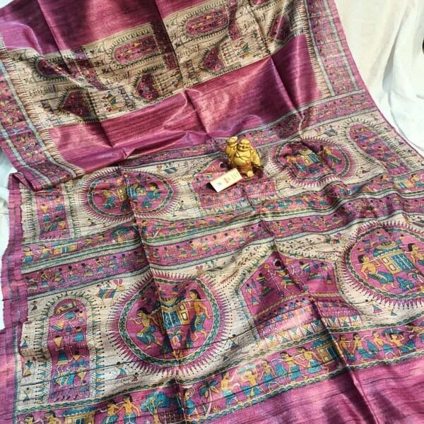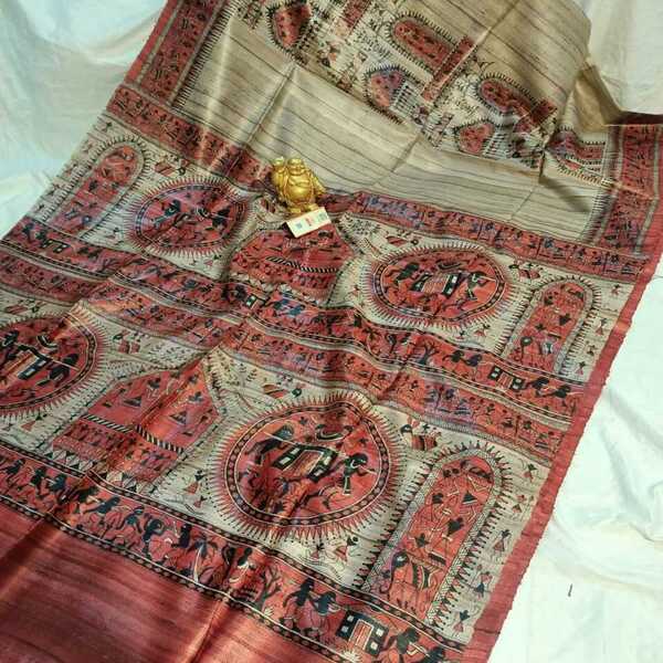 4565 Piece Description : A Tussar Ghicha Madhubani Hand Print Saree Is A Beautiful Blend Of Rustic Elegance And Traditional Art. Made From Natural Tussar And Ghicha Silk, It Features Hand-printed Madhubani Motifs Inspired By Indian Folklore And Nature. The Rich Texture Of The Fabric Combined With Intricate Artwork Gives It A Graceful Ethnic Appeal, Perfect For Festive And Cultural Occasions. Location : Jharkhand, India